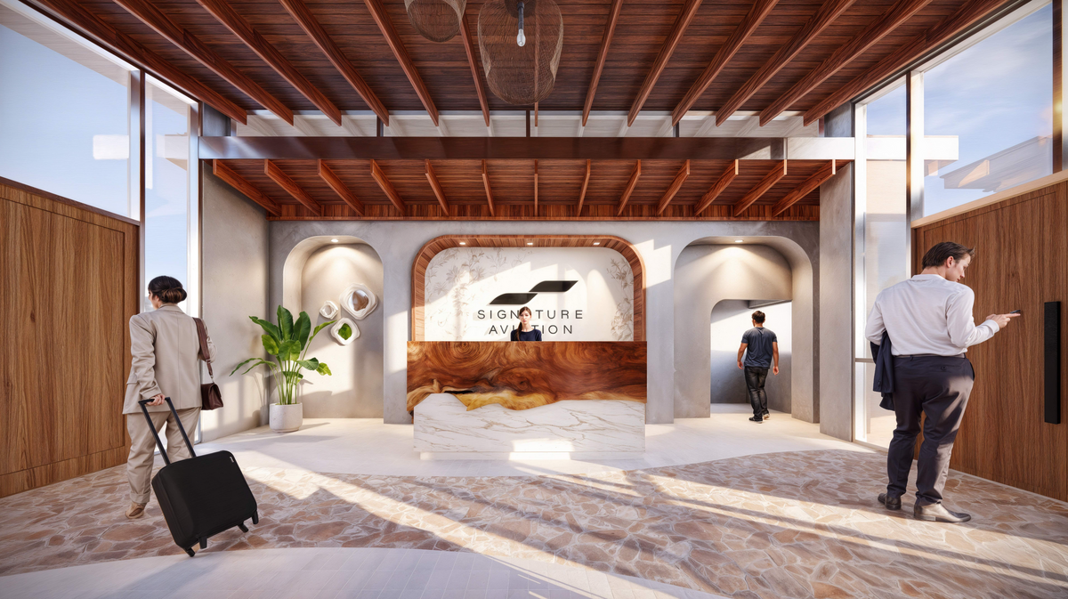 Tailored for Signature Aviation’s elite clientele, the terminal transforms travel into an immersive experience that captures Kauai’s serene landscapes and rich traditions, offering a seamless fusion of functionality, luxury, and local character.